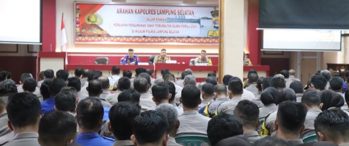 Lampung Selatan, SIBER88.CO.ID_Menghadapi pengamanan tahapan pemungutan suara pemilu 2024, Polres Lampung Selatan melaksanakan pembekalan kepada personil pengamanan di TPS, Selasa(6/2/2024).