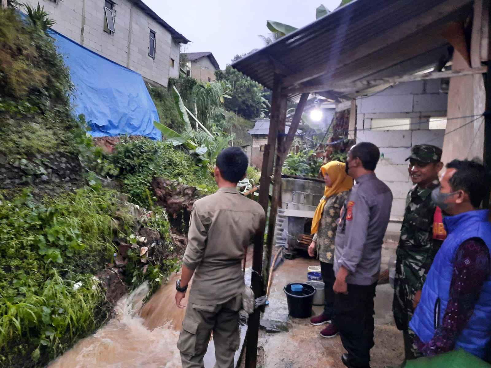 “Rumah milik sdr. Saun yang berada disamping selokan setinggi 6 meter terbawa longsor sedangkan rumah yang lainnya hanyak mengalami kerusakan ringan seperti dinding retak.” Ungkap Kapolsek Ciampea Kompol Beben Susanto, SH.