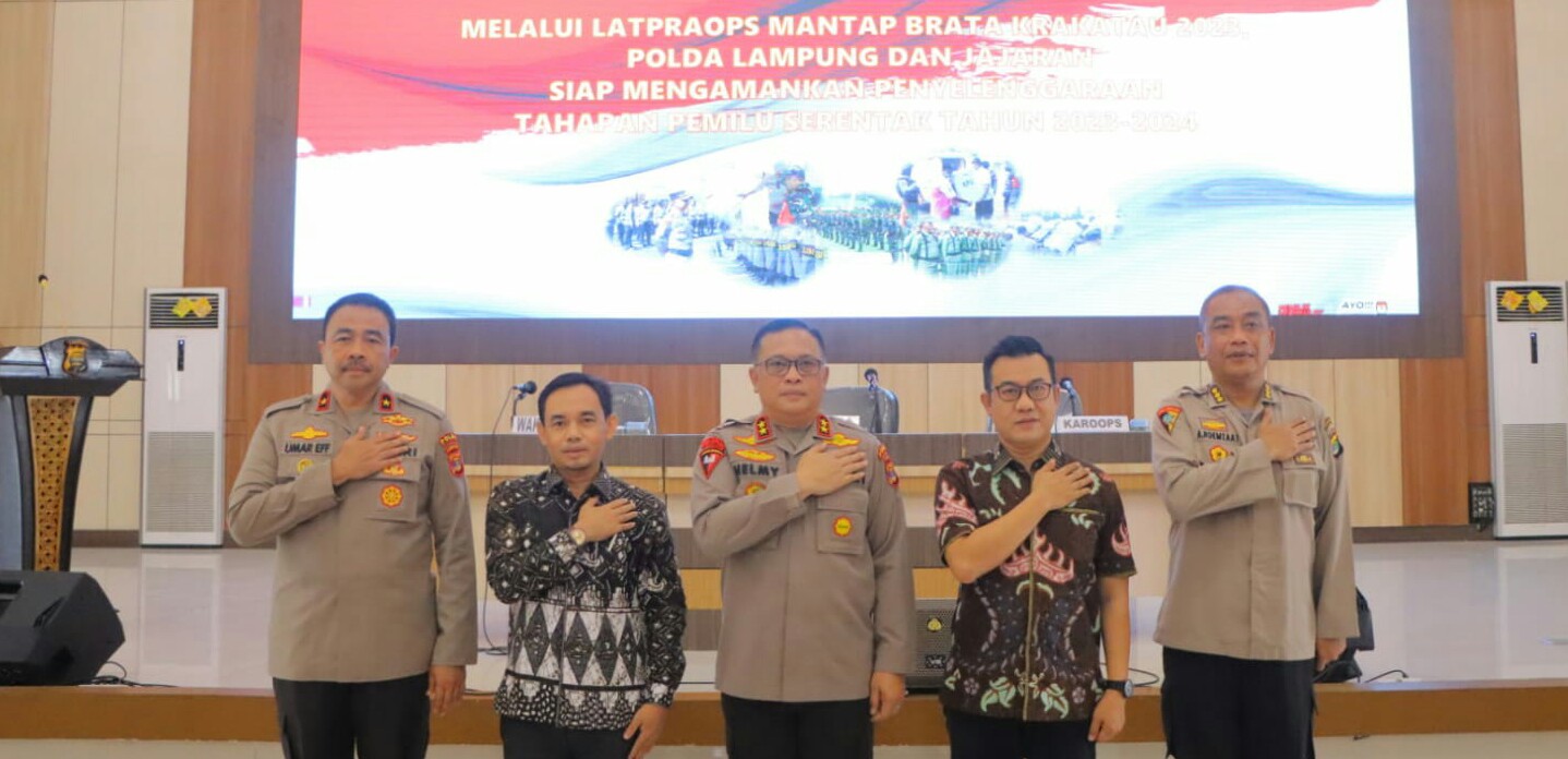 Kapolda Lampung, Irjen Pol Helmy Santika bersama Wakapolda Lampung, Brigjen Pol Dr Umar Effendi membuka kegiatan Latpraops Mantap Brata 2023 yang dihadiri Pejabat Utama Polda Lampung, seluruh Kapolres, kabag Ops, Kasat Intelkam, Kasat Binmas, Kasat Sabhara, Kasat Lantas dan Kasat Reskrim.