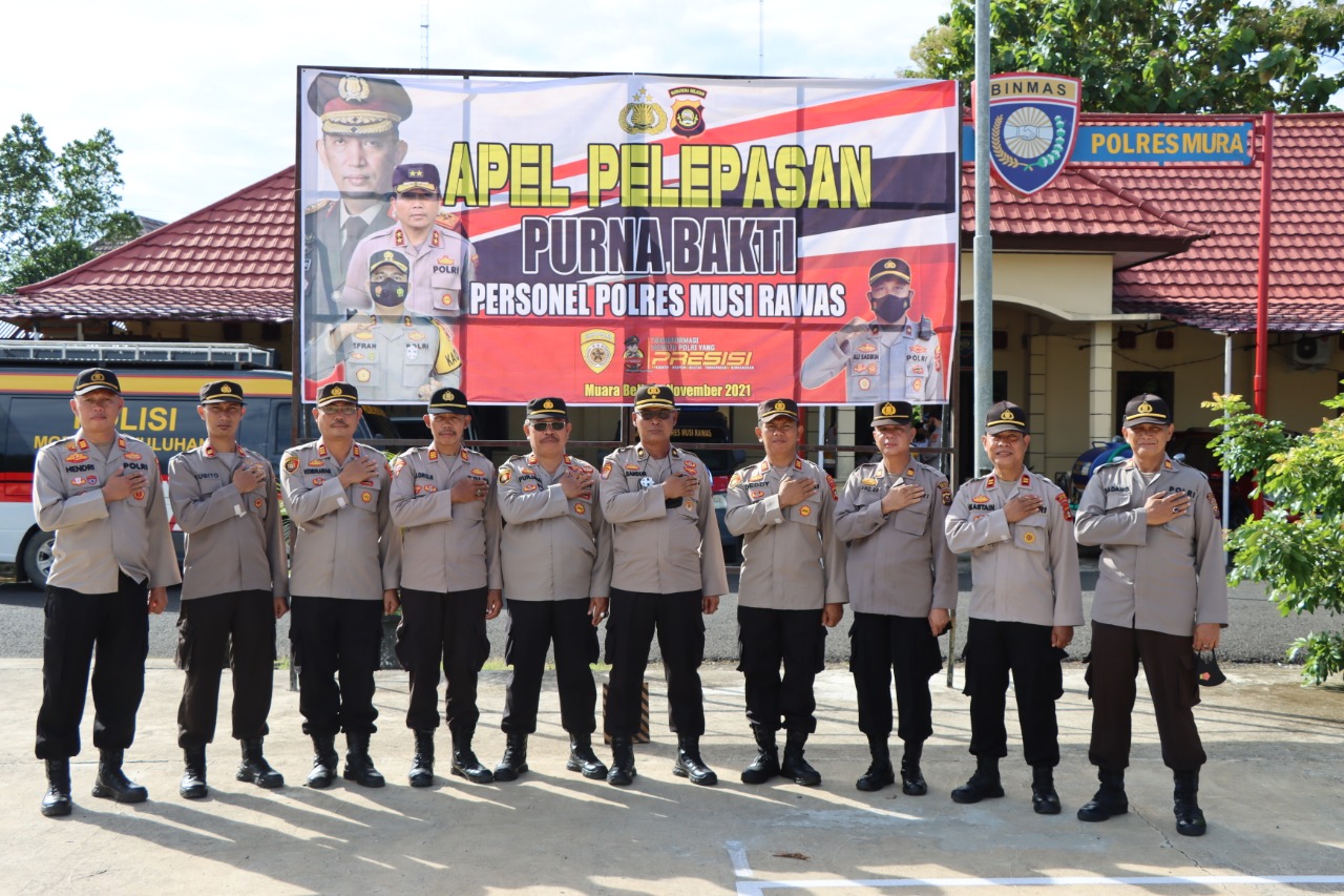 Musi Rawas, SIBER88.CO.ID_Polres Musi Rawas menggelar Apel Pelepasan Purna Bhakti, dihalaman Apel Mapolres Mura, Pusat Perkantoran Agropolitan Center Pemkab Mura, sekitar pukul 07.30 WIB, Senin (29/11/21).