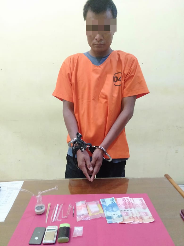 Selanjutnya dilakukan penggeledahan dengan disaksikan oleh aparat desa setempat, tim menemukan 1 Paket kecil Narkotika Jenis Shabu yang dibungkus dengan plastik bening, Handphone Merk VIVO Type 1904 warna Biru Metalic, Handhpone Merk Nokia Type TA-1030 warna Orange, timbangan digital, kotak permen warna hitam dan kuning stabilo, bong, 2 Kaca Pirex, jarum kompor, 3 sendok dari pipet, 2 bungkus plastik bening, 3 pipet kecil,