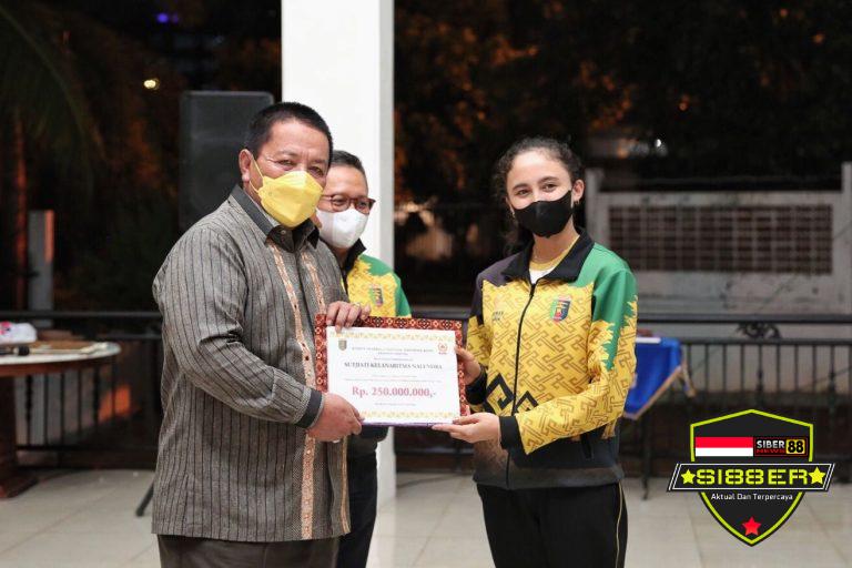Bandar lampung SIBER88.CO.ID_Atlet senam ritmix Lampung kelahiran Amerika Serikat, Sutjiati Narendra, dan atlet menembak Wira Sukmana, mendapatkan bonus sebesar Rp 500 juta, setelah berhasil meraih dua medali emas, pada pertandingan PON xx papua pada pertengahan Oktober 2021 lalu penyerahan di lakukan Gubernur Lampung, di rumah dinas Gubernur Lampung Mahan Agung, kamis malam 22-10-2021