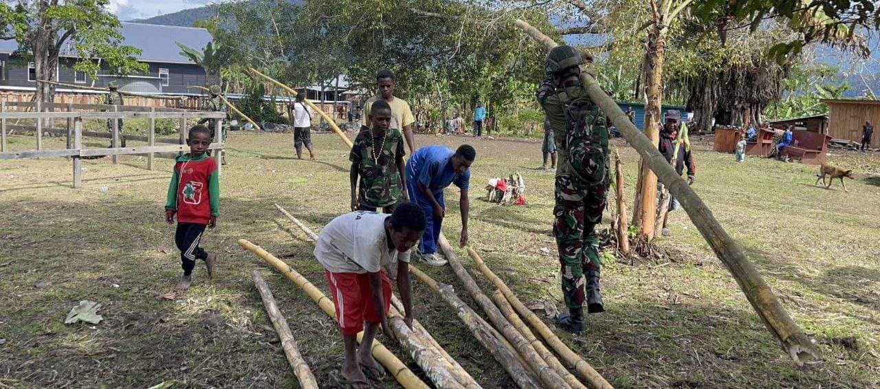Dalam kegiatan tersebut, personel Satgas bersama masyarakat bergotong royong mengangkat bambu, menyiapkan, serta memotong bambu yang akan digunakan untuk pembuatan pagar di lingkungan gereja.