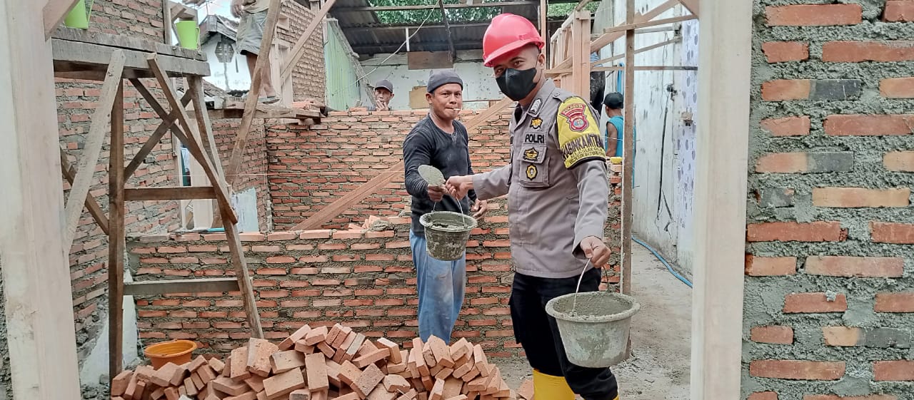 Tampak Bhabinkamtibmas bersama warga bahu-membahu membantu memperbaiki rumah milik Kadir mulai dari membersihkan puing sisa-sisa bangunan lama, mengaduk semen sampai memasang genteng.