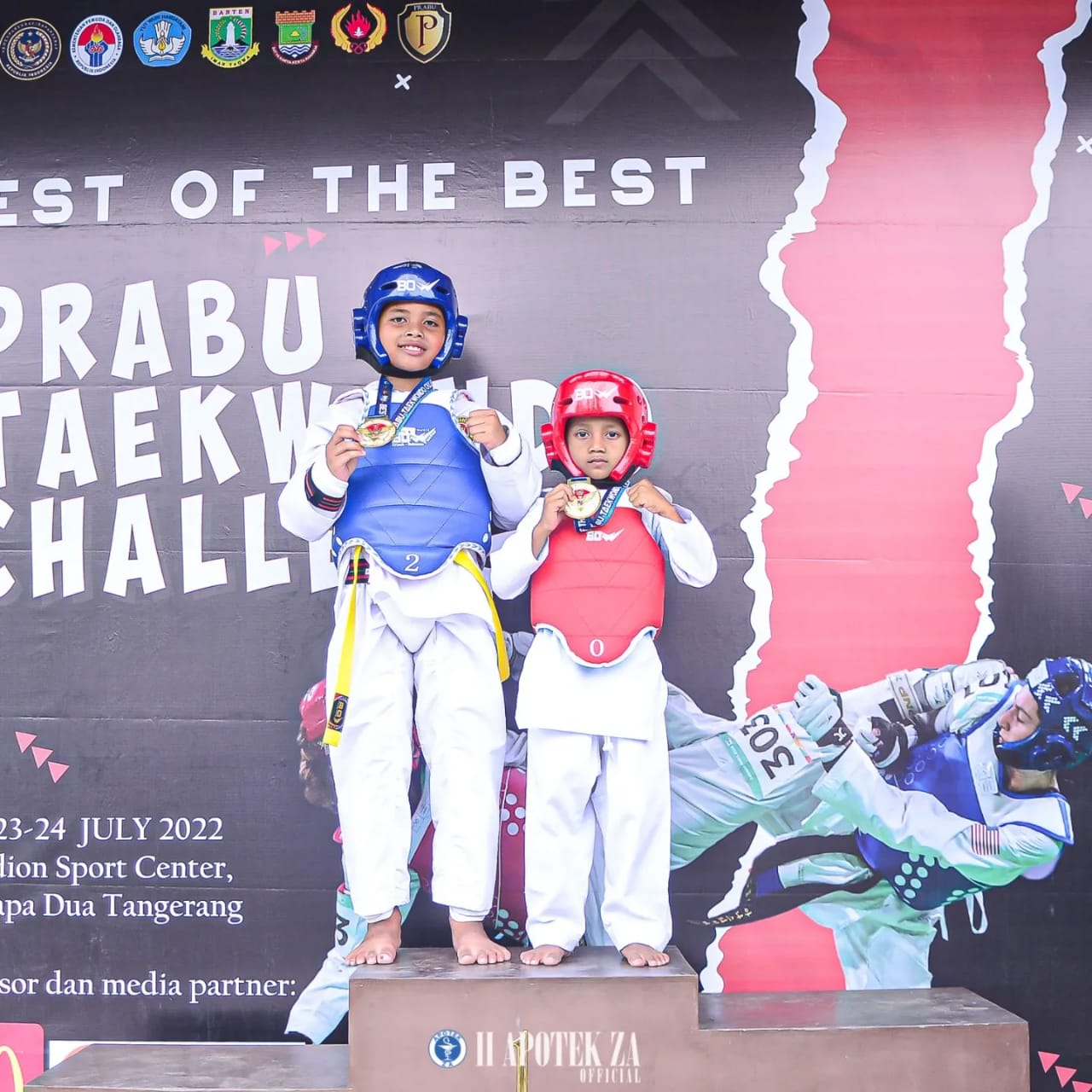 Tangerang Banten, SIBER88.CO.ID_Buah jatuh tidak jauh dari pohonnya. Pribahasa tersebut begitu tepat diberikan kepada M. Dzaki Hadiyanto dan Ezar Abinaya Hadiyanto yang merupakan putra pasangan Hadiyanto., M.Pd dan Ika Rustiana, AM. Keb, mampu meraih medali emas pada kejuaraan Prabu Taekwondo Challenge, tingkat nasional dilaksanakan di Indoor Stadium, Sport Center Kelapa Dua, Kabupaten Tangerang.