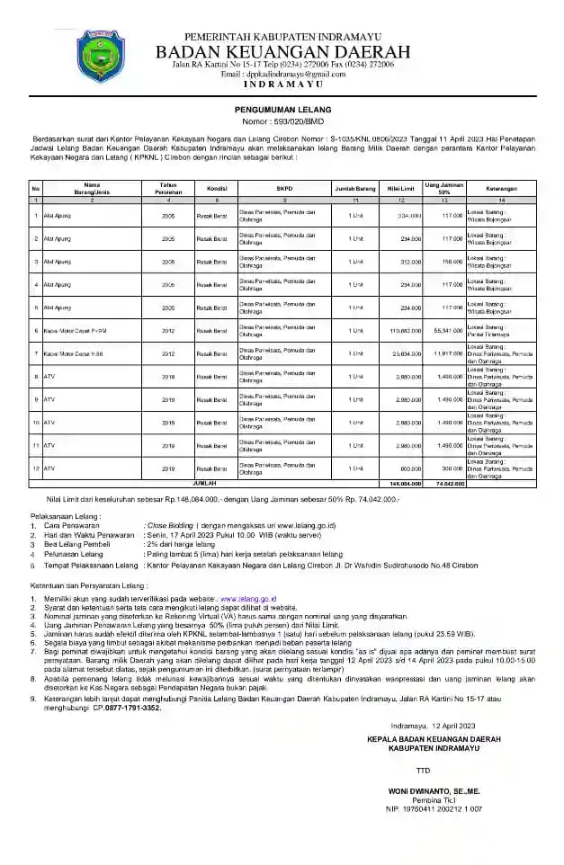 Malik juga menjelaskan waktu penawaran akan dilakukan pada tanggal 17 April 2023. Jadi, tambahnya, buat yang bakal mengikuti lelang silakan mendaftar sebelum tanggal tersebut ke kantor BKD Indramayu di Jalan RA Kartini No. 15-17 Indramayu atau menghubungi 0877-1791-3352.
