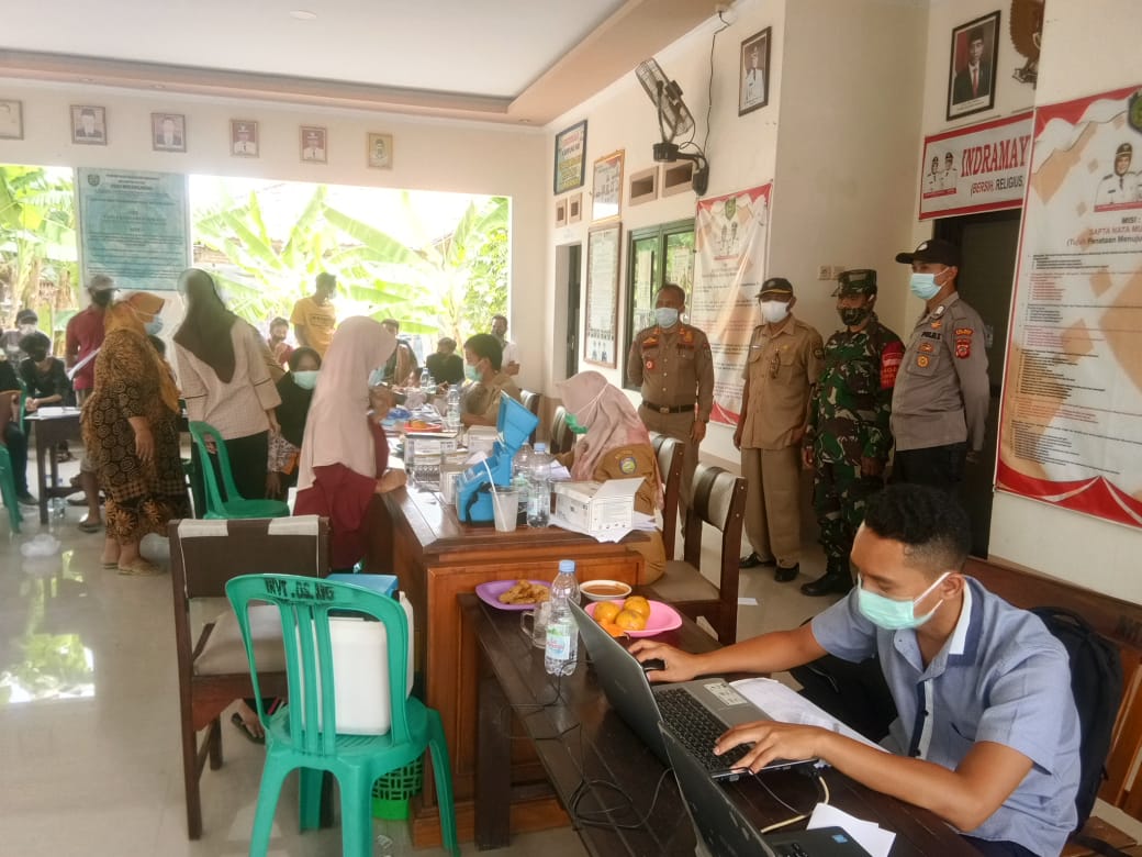 Bripka Tanto anggota Polsek Sliyeg Polres Indramayu yang juga sebagai Bhabinkamtibmas desa Mekargading-Gadingan bersama forkopimcam Sliyeg memonitoring kegiatan percepatan vaksinasi.