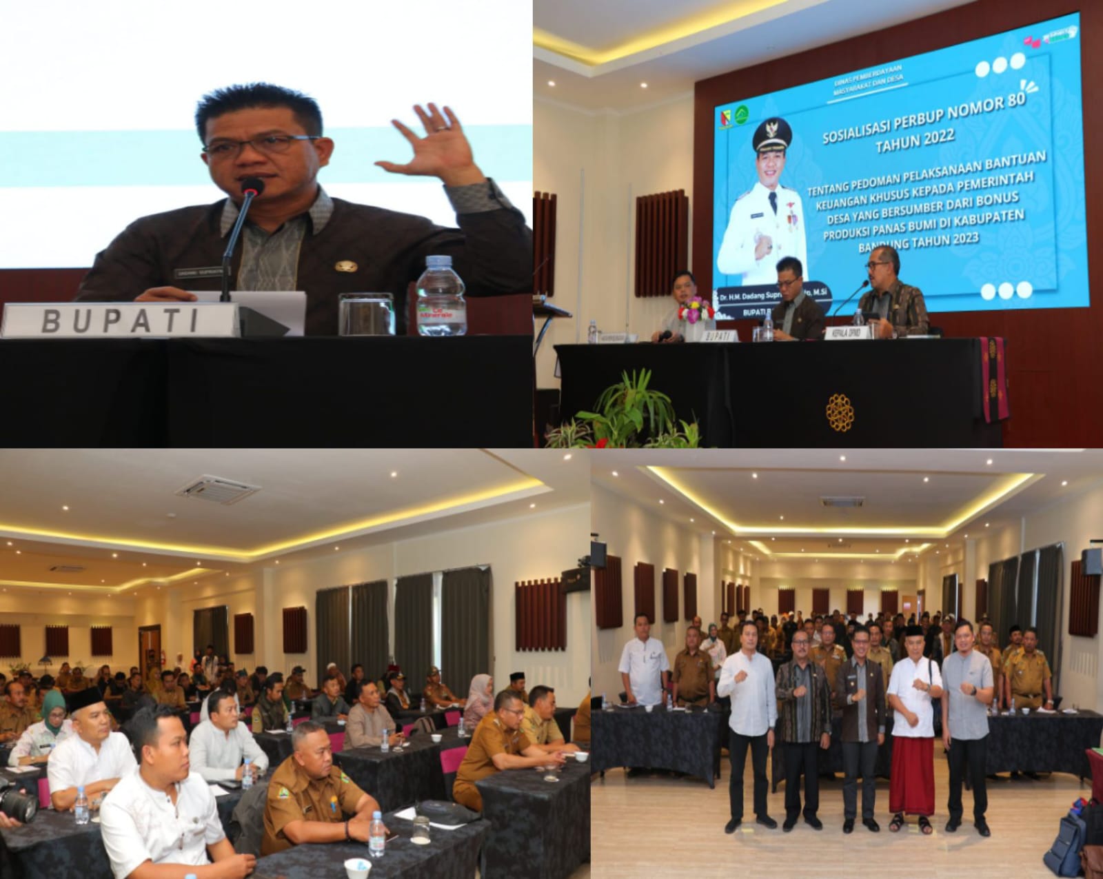 Bandung Jabar, SIBER88.CO.ID_Pemerintah Kabupaten (Pemkab) Bandung melalui Dinas Pemberdayaan Masyarakat dan Desa (DPMD) melaksanakan sosialisasi Peraturan Bupati (Perbup) No. 80/2022 tentang Pedoman Pelaksanaan Bantuan Keuangan Kepada Pemerintah Desa yang Bersumber Dari Bonus Produksi Panas Bumi di Kabupaten Bandung Tahun 2023 di Hotel Grand Sun Shine Soreang, Selasa (18/7/2023).