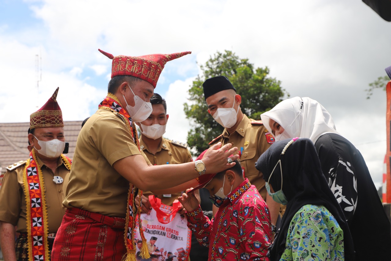 Penyerahan seragam sekolah gratis oleh Pemerintah Kabupaten (Pemkab) Lambar kepada peserta didik baru SD/MI dan SMP/MTs tahun pelajaran 2021-2022 se-kecamatan Batu Ketulis.
