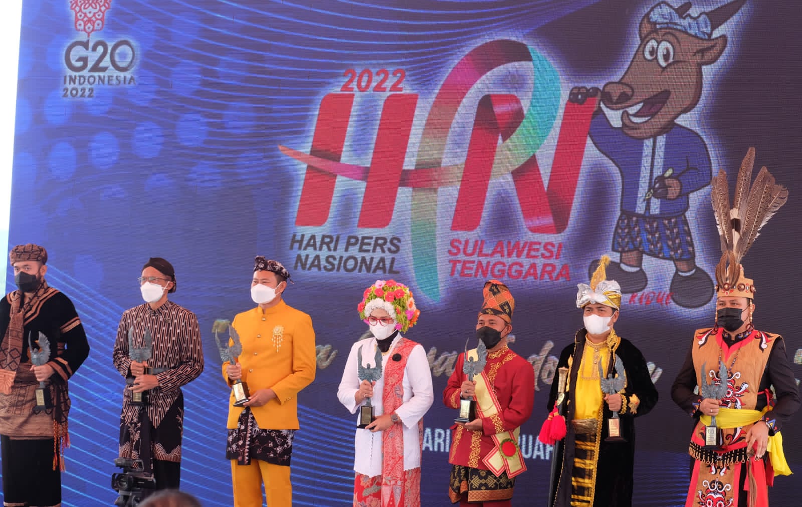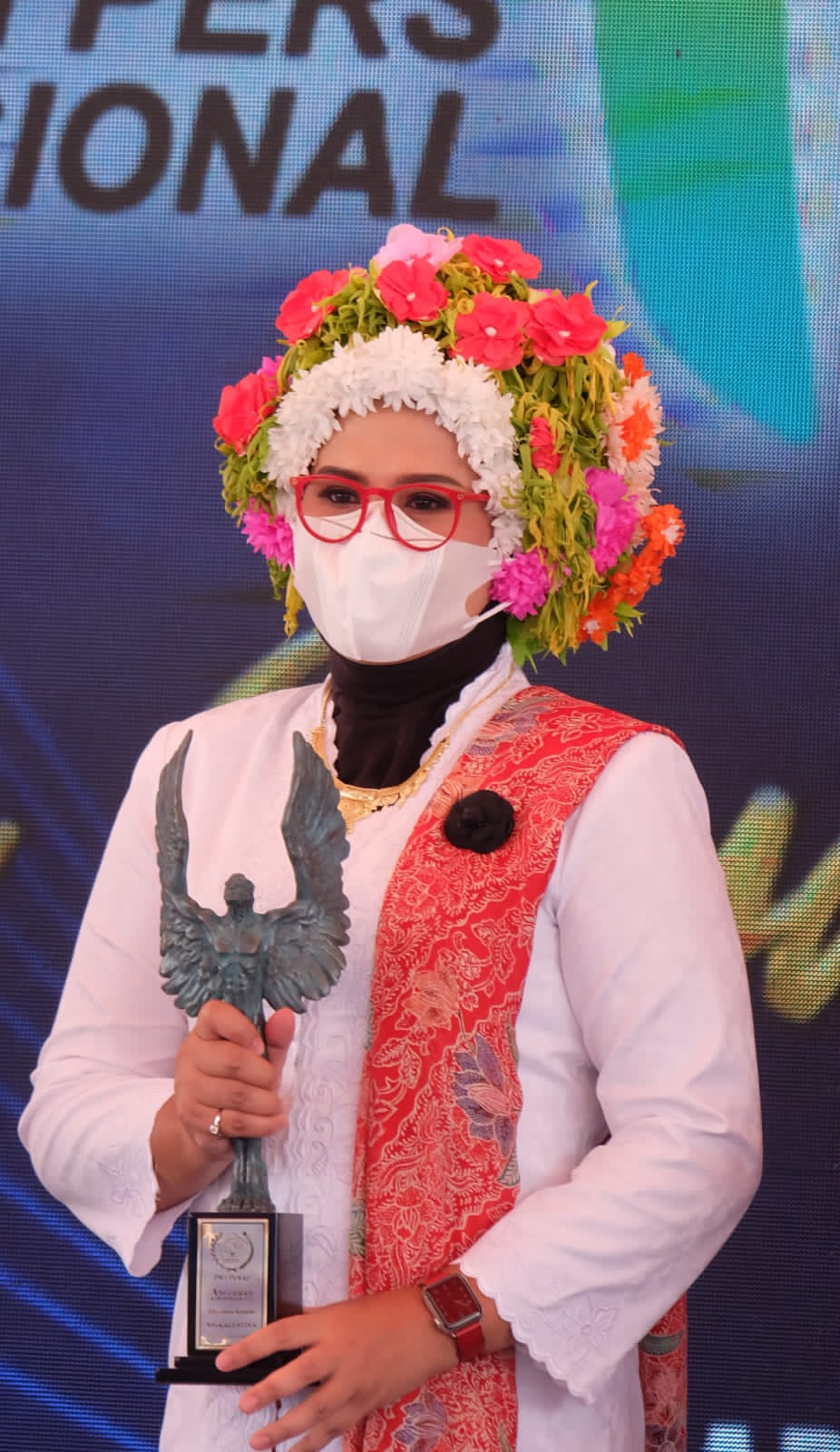 Nina tampil dihadapan publik di Kendari mengenakan pakaian adat Ngarot, sarat dengan rangkaian bunga di kepala. Baju adat yang Nina kenakan sontak menyedot perhatian peserta HPN Kendari 2022. (Bzz)
