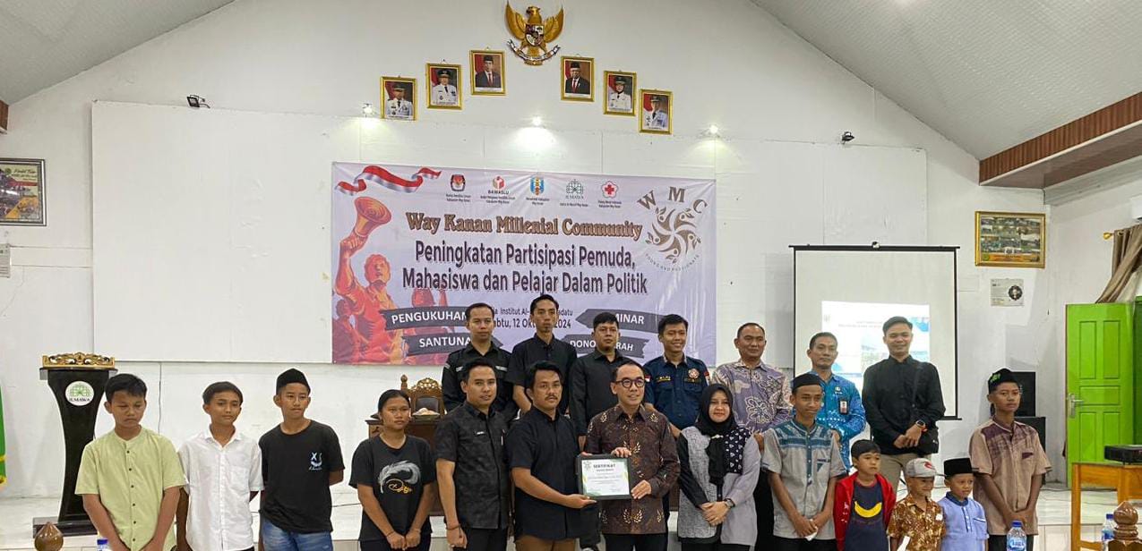 Way Kanan Lampung, SIBER88.CO.ID_Bupati Way Kanan, Raden Adipati Surya mengukuhkan Way Kanan Millenial Community(WMC) dan seminar peningkatkan partisipasi pemuda dalam politik, serta menggelar santunan anak yatim.