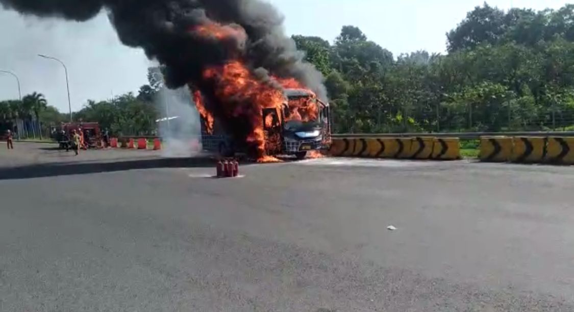 Bogor Jabar, SIBER88.CO.ID_Sebuah bus MGI jurusan Bogor – Pelabuhan ratu terbakar pada Selasa pagi l (09/08) tepat di gerbang tol Ciawi kecamatan Sukaraja kabupaten Bogor.