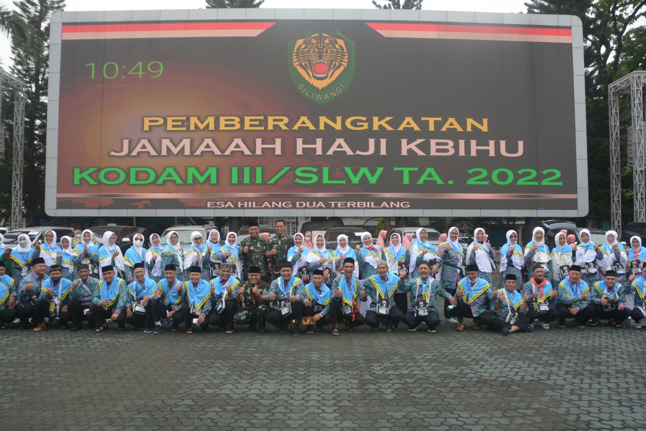 Bandung Jabar, SIBER88.CO.ID_Pangdam III/Slw Mayjen TNI Kunto Arief Wibowo yang diwakili oleh Kabintaljarahdam III/Siliwangi Kolonel Inf Budi Iman Santoso, S.E., memberangkatkan 56 calon jemaah haji Kodam III/Siliwangi tahun 1443 H/2022 M yang tergabung dalam Kelompok Bimbingan Ibadah Haji dan Umroh (KBIHU) Kodam III/Siliwangi di Masjid Al-Ikhlas Makodam III/Siliwangi Jalan Aceh No. 69, Kota Bandung, Jabar, Jum’at (17/06/2022).