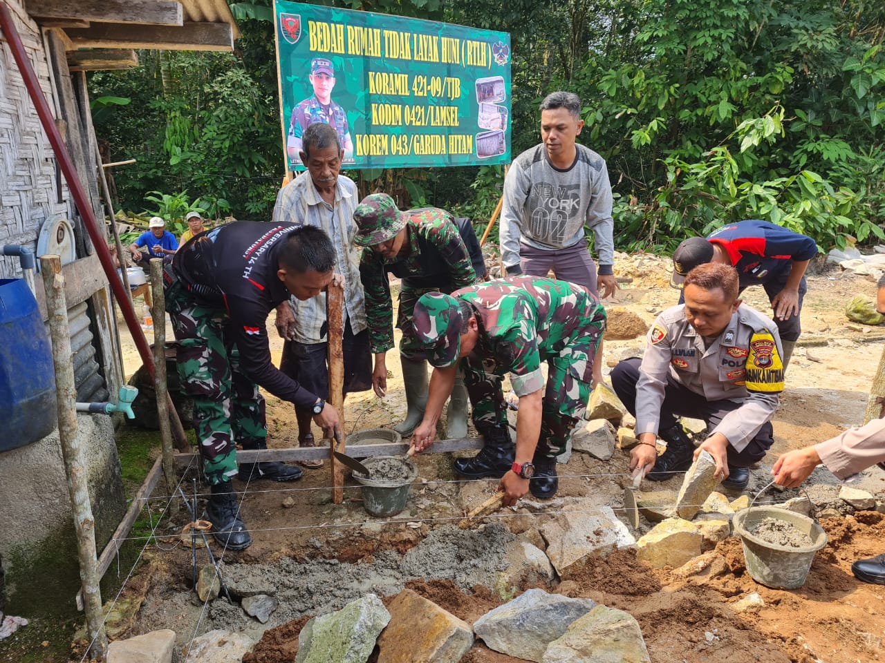 Danramil 421-09/Tjb Kodim 0421/Lampung Selatan (Lamsel), dalam rangka melakukan peletakan batu pertama pembangunan bedah rumah dalam rangka melaksanakan Perintah Program Pimpinan TNI AD untuk meningkatkan tarap hidup masyarakat di wilayah Binaannya.