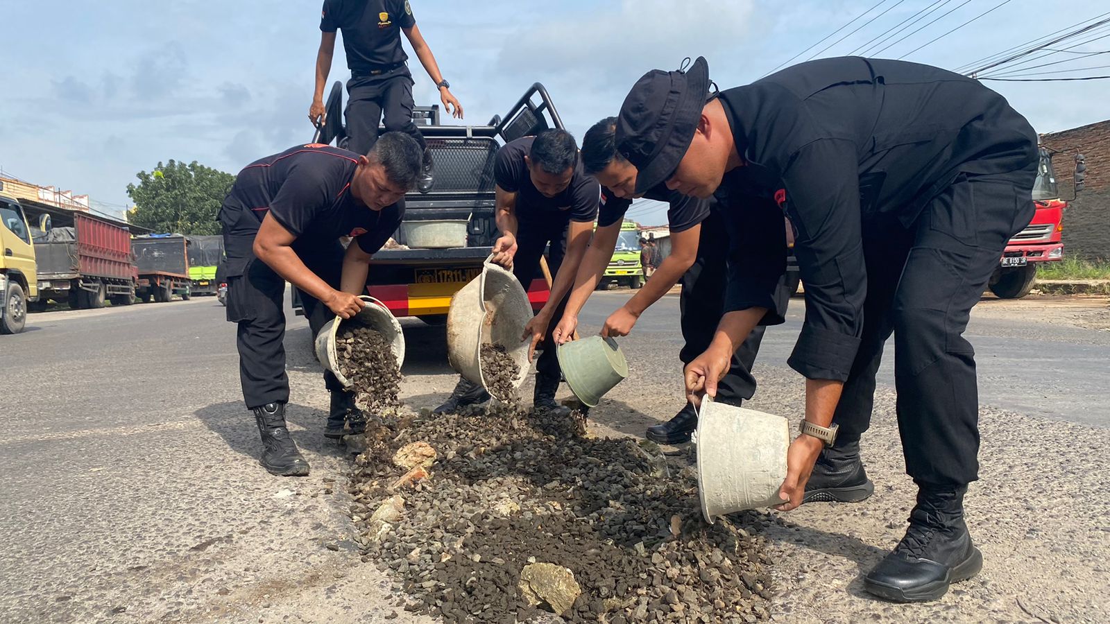 Bandar Lampung, SIBER88.CO.ID_Danyon A Pelopor Kompol Jemmy Yudanindra SH SIk bersama anggotanya terlihat warga sedang memperbaiki jalan yang rusak dan berlubang dengan cara menambalnya menggunakan batu batu di Jl. Soekarno Hatta depan Markas Komando Batalyon A pada Minggu (26/03/23).