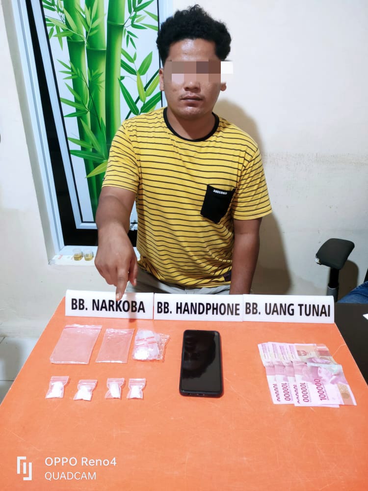 Barang bukti yang diamankan berupa 4 paket Narkoba jenis sabu-sabu yang dibungkus dengan Plastik Bening, (Bruto 11,80 Gram). 1 ball plastik bening, 2 plastik bening, HP Realme dan uang Rp 500 ribu.