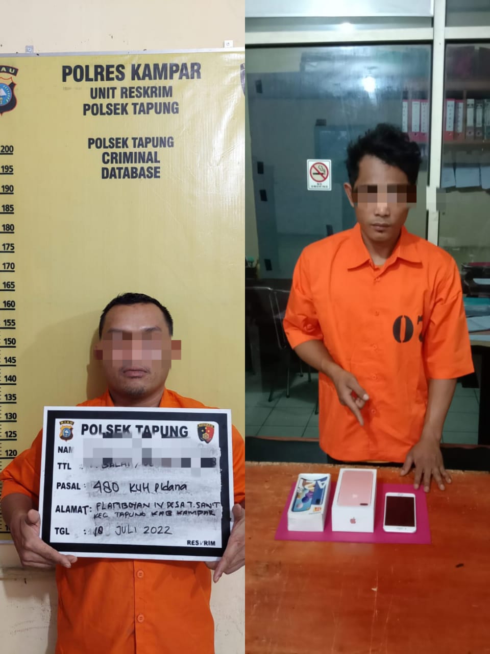 Kampar Riau, SIBER88.CO.ID_Dua orang pelaku yang diduga pelaku pencurian dan Penada barang hasil curian di ringkus Polsek Tapung, dengan modus membuka pintu rumah korban, pelaku mengambil dua Unit HP milik korban.