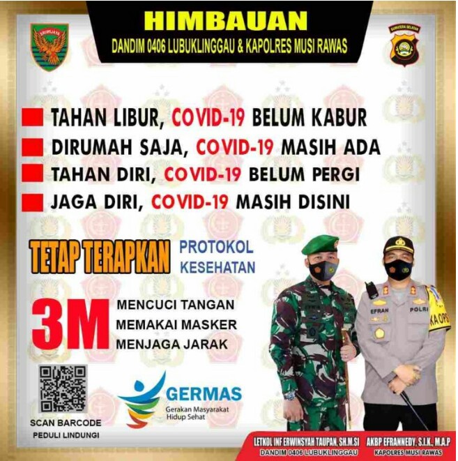 Sementara itu, Dandim 0406 Lubuklinggau, Letkol Inf Erwinsyah Taupan, mengatakan himbauan tersebut sengaja dibuat kiranya untuk dipatuhi, oleh sebab itu, khususnya masyarakat Kabupaten Mura, untuk mematuhi himbauan tersebut.