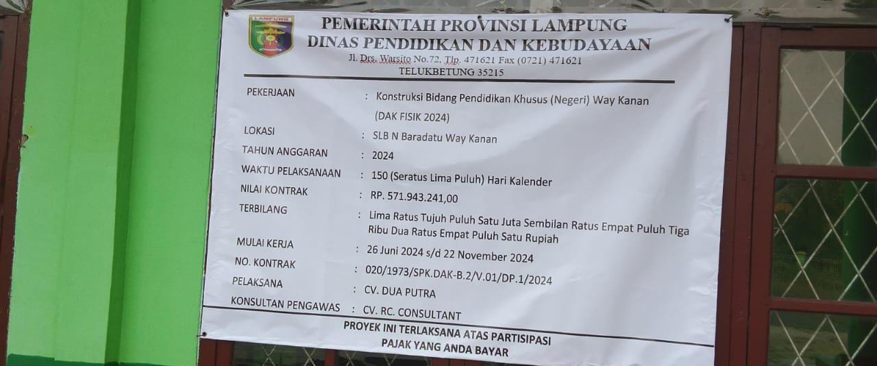 Pekerjaan kontruksi bangunan di SLBN Baradatu Way Kanan tersebut bersumber dari anggaran dana DAK tahun 2024 pada satuan kerja Dinas Pendidikan dan Kebudayaan Provinsi Lampung senilai Rp571.943.241 yang dikerjakan oleh CV Dua Putra dengan Konsultan Pengawas CV RC CONSULTANT, diduga kuat terindikasi bermasalah dan sarat penyimpangan dengan unsur disengaja.
