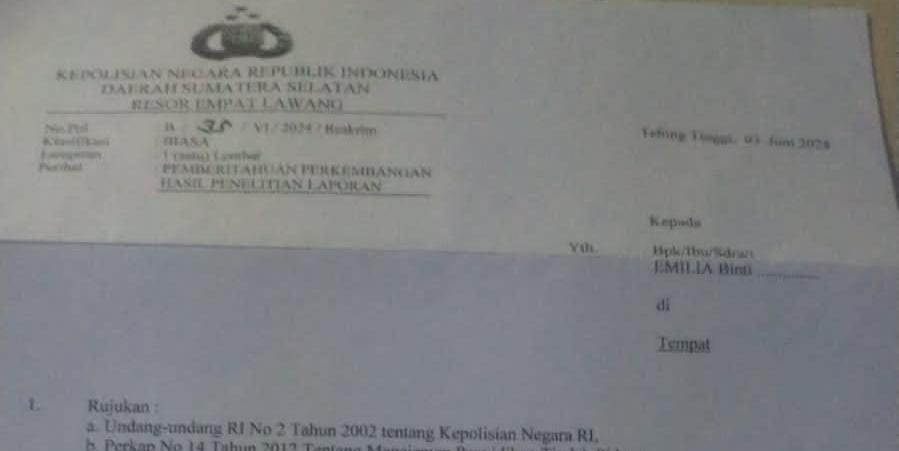 Kasus tersebut sudah dilaporkan ke Polres Empat Lawang pada tanggal 25 Mei 2024 yang lalu dengan Nomor STILP/LP/B/ 124/V/2024/SPKT/POLRES EMPAT LAWANG/POLDA SUMATERA SELATAN. Berdasarkan Laporan Polisi Nomor: LP/B/124/V/2024/SPKT/POLRES EMPAT LAWANG/POLDA SUMATERA SELATAN.