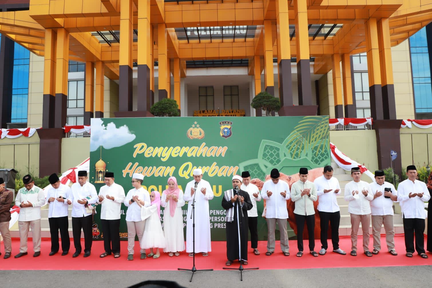 Usai pelaksanaan sholat idul adha, didahului doa bersama yang dipimpin ustadz Zulhendri, Kapolda Riau Iqbal didampingi Ketua Bhayangkari Daerah Nyonya Nindya Iqbal menyerahkan secara simbolis 3 ekor hewan qurban jenis sapi limosin kepada pengurus masjid yang selanjutnya akan dilakukan pemotongan di Masjid Al Muthmainah dan masjid An Nur Pekanbaru.