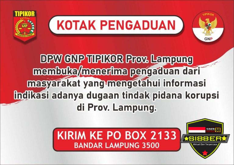 Bandar Lampung, S8BER88.CO.ID//Dewan Pimpinan Wilayah (DPW) Gerakan Nasional Pengawasan Tindak Pidana Korupsi (GNP Tipikor) Provinsi Lampung membuka Kotak Pos (PO Box) pengaduan masyarakat dengan Nomor PO BOX 2133 BDL 35000.