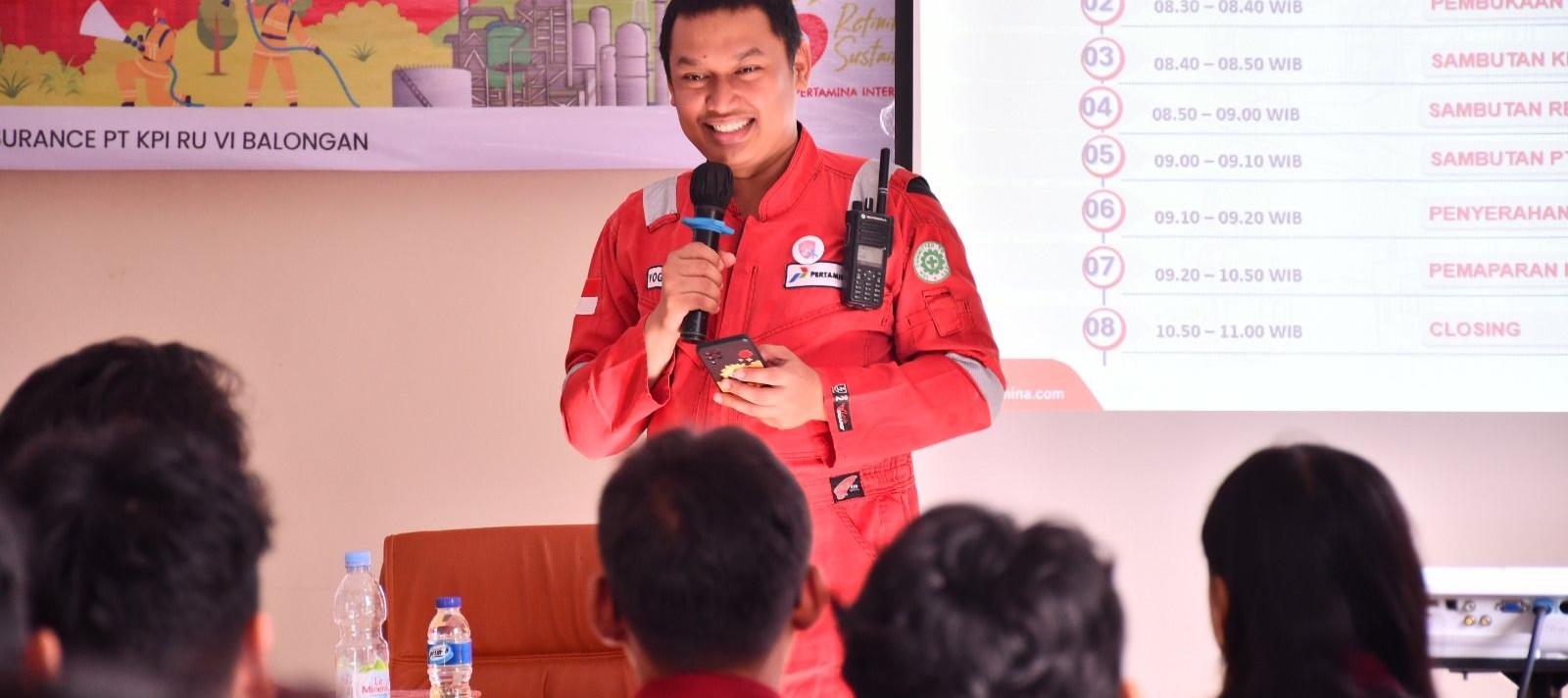 Kegiatan Fire Goes to campus ini materi terkait tools and equipment atau peralatan pemadam kebakaran di Kilang Balongan yang disampaikan oleh Shift Supervisor Fire Brigade RU VI, Agus Hariyanto.