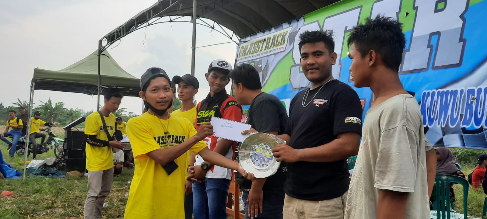 Event grasstrack usai,Anas Ghozali leader sponsor Munir Jaya Abadi memberikan hadiah kepada para pemenang didampingi Kepala Desa Bunder Dedi Amd kep dan ketua panitia pelaksana Karyanto.