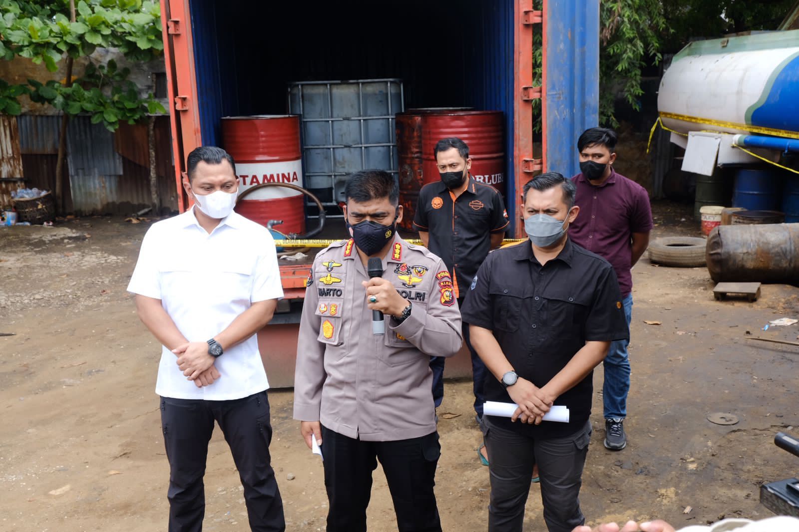 “Dioplos (dicampur) di gudang ini, dengan komposisi tertentu sehingga menghasilkan mirip seperti solar non subsidi,” terang Kabid Humas Polda Riau Kombes Sunarto dalam jumpa persnya bersama Direktur Reskrimsus Kombes Ferry Irawan dan didampingi Kasubdit IV AKBP Dhovan Oktovianto, Kamis (7/4/2022) siang.
