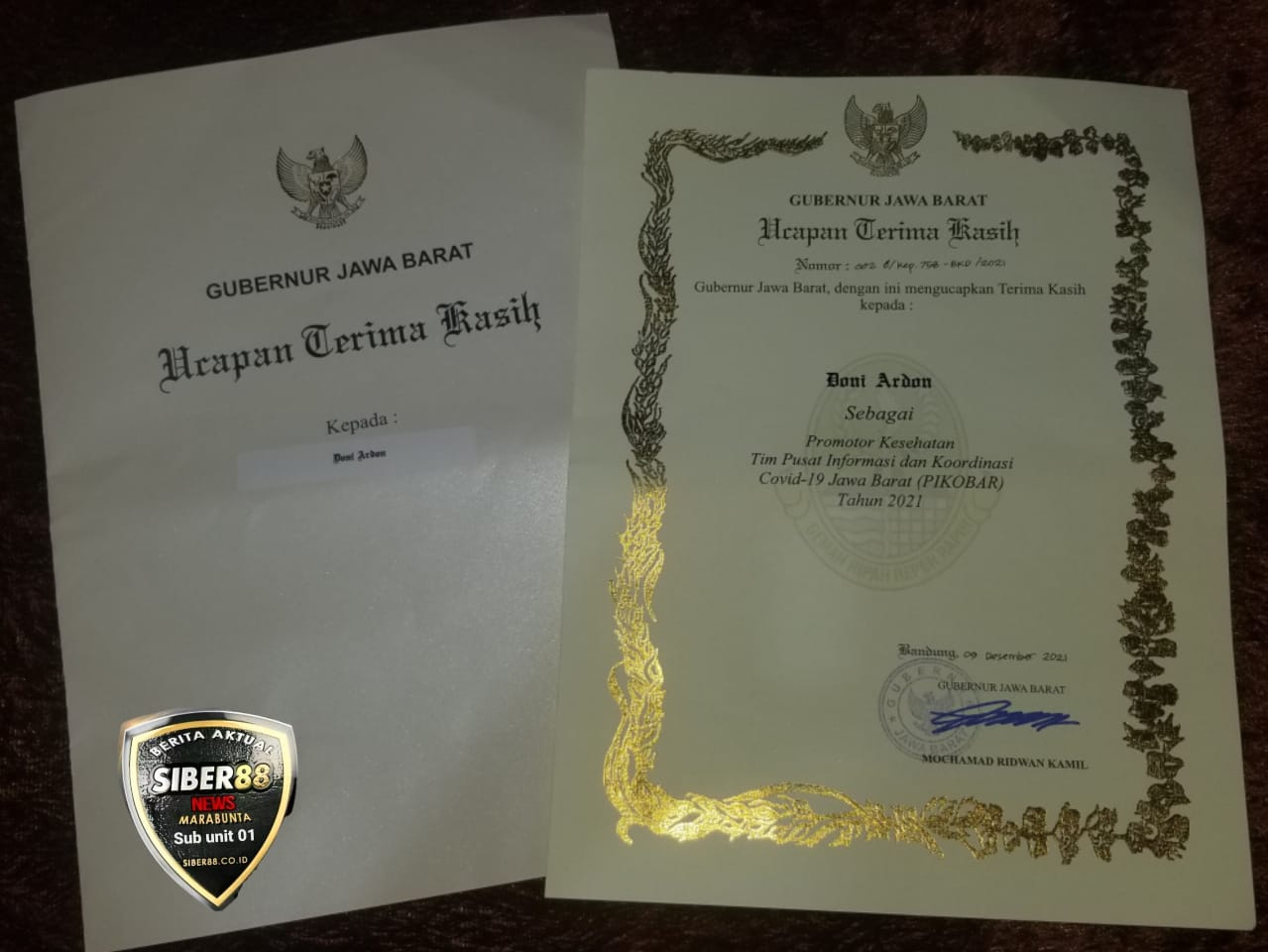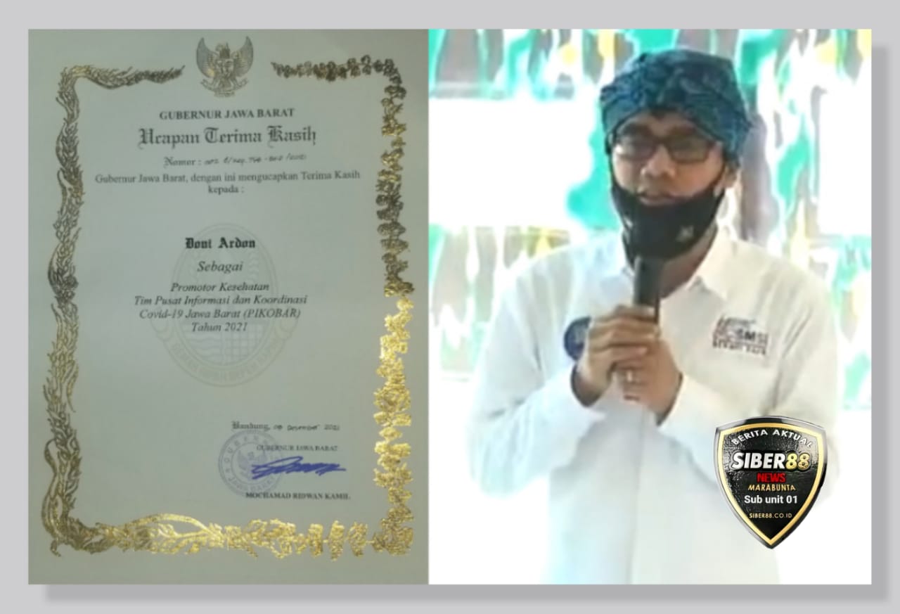Bekasi Jabar, SIBER88.CO.ID_Mengawali tahun 2022, Gubernur Jawa Barat Ridwan Kamil memberi penghargaan kepada Doni Ardon sebagai promotor kesehatan Tim Pusat Informasi dan Koordinasi Covid-19 Jawa Barat 2021. Selama pandemi Covid-19, ketua Serikat Media Siber Indonesia (SMSI) Bekasi Raya itu aktif mensosialisasikan protokol kesehatan Covid-19, target herd immunity, pemulihan ekonomi dan cegah hoax vaksinasi melalui media siber mitranews.net.