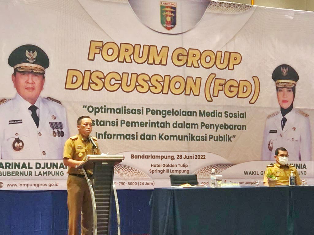 Bandar Lampung, SIBER88.CO.ID_Kepala Dinas Kominfo dan Statistik Provinsi Lampung, Ganjar Jationo, membuka Forum Group Discussion (FGD) admin media sosial Instansi lingkungan Pemerintah Provinsi Lampung, bertempat di Hotel Golden Tulip Spring Hill, Selasa (28/06/2022).