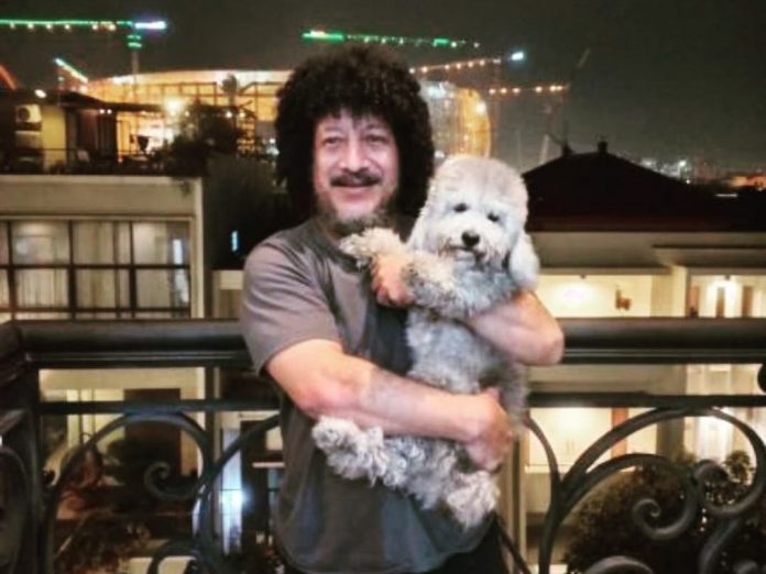 Dalam foto, tampak Habib Kribo tersenyum ke arah kamera sambil menggendong seekor anjing berwarna putih.