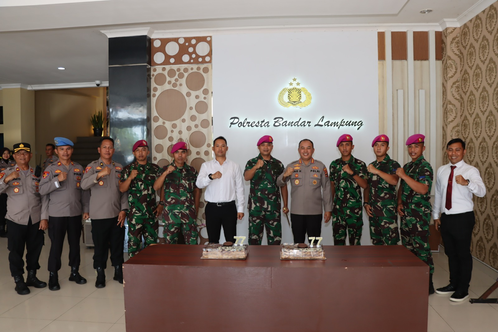 Kapolresta Bandar Lampung Kombes Pol Ino Harianto, S.I.K., M.M., dalam sambutannya mengucapkan terima kasih kepada rekan rekan dari Lanal Lampung dan Yonif 9 Marinir Lampung yang telah datang ke Mapolresta Bandar Lampung untuk memberikan ucapan selamat dan kejutan Hari Bhayangkara Ke 77.