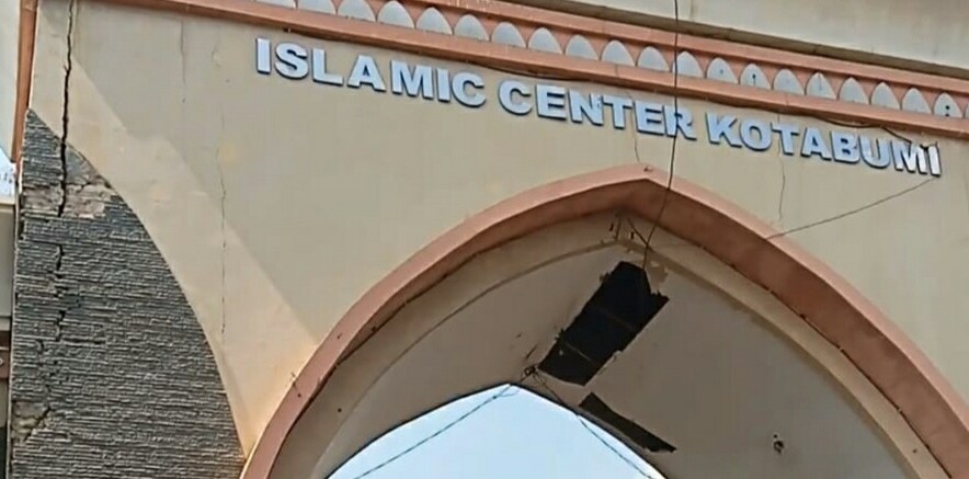 Lampung Utara, SIBER88.CO.ID_Gerbang Islamic Center Kotabumi yang berada di jalan Lintas Sumatra Kelurahan Kota Alam sudah retak dan perlu perbaikan Minggu, (15/10/23)