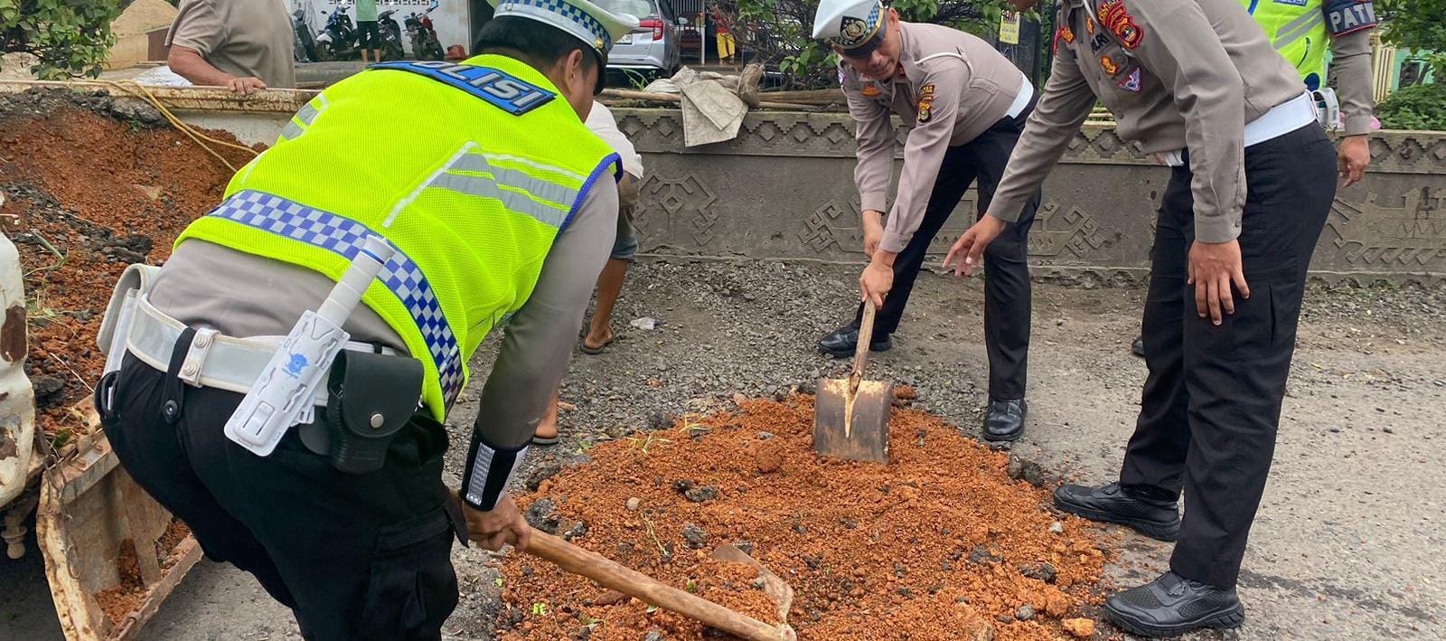 Hindari Lakalantas,Sat Lantas Polres Lampung Utara Timbun Jalan Berlubang