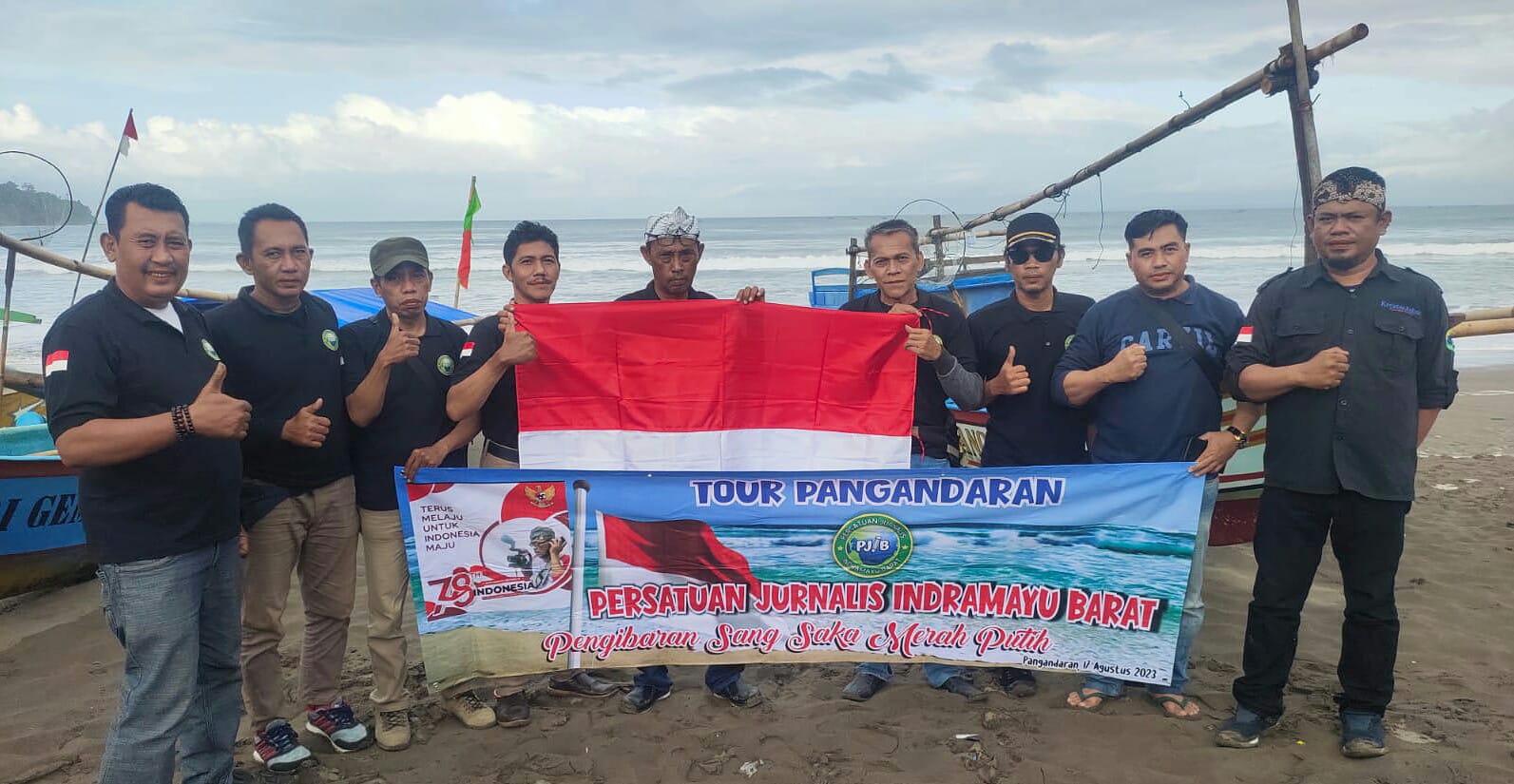 Pangandaran Jabar, SIBER88.CO.ID_Persatuan Jurnalis Indramayu Barat(PJIB) mengisi momen HUT RI ke-78 dengan kegiatan pengibaran Sang Saka Merah Putih di tempat wisata Pantai Pangandaran Jawa Barat,Kamis(17/8/2023).