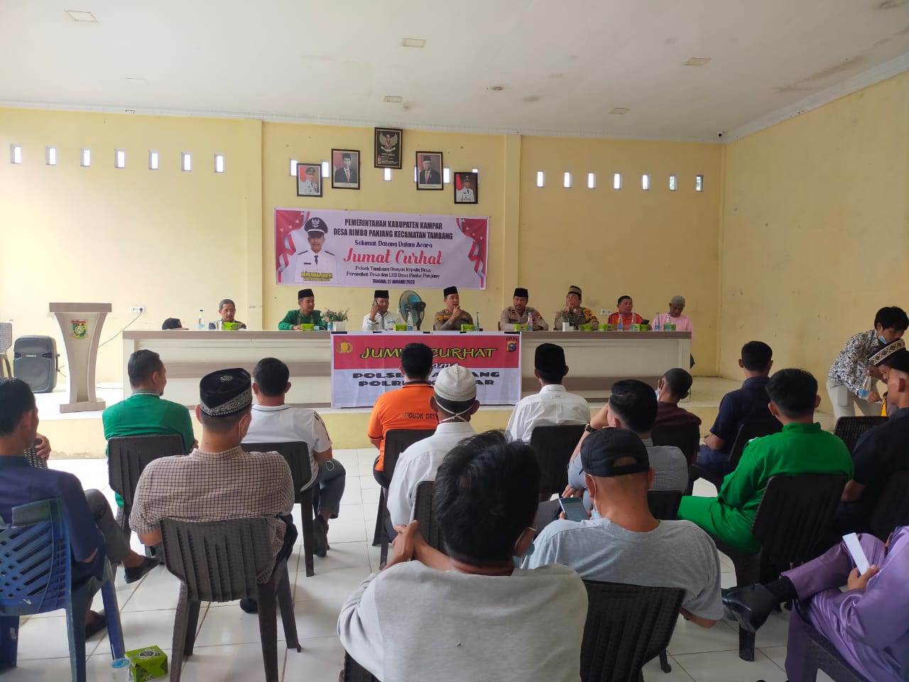 Kampar Riau, SIBER88.CO.ID_Jumat Curhat Kapolsek Tambang, IPTU Mardani Tohenes, SH, MH didampingi sejumlah personil Polsek Tambang diskusi terkait situasi Kamtibmas dengan Camat Tambang, Kades Rimbo Panjang, Aparat Desa Rimbo Panjang serta masyarakat Desa Rimbo Panjang Kecamatan Tambang Kabupaten Kampar, Jumat, (27/1/23), sekira pukul 10.00 WIB, di aula kantor desa Rimbo Panjang.