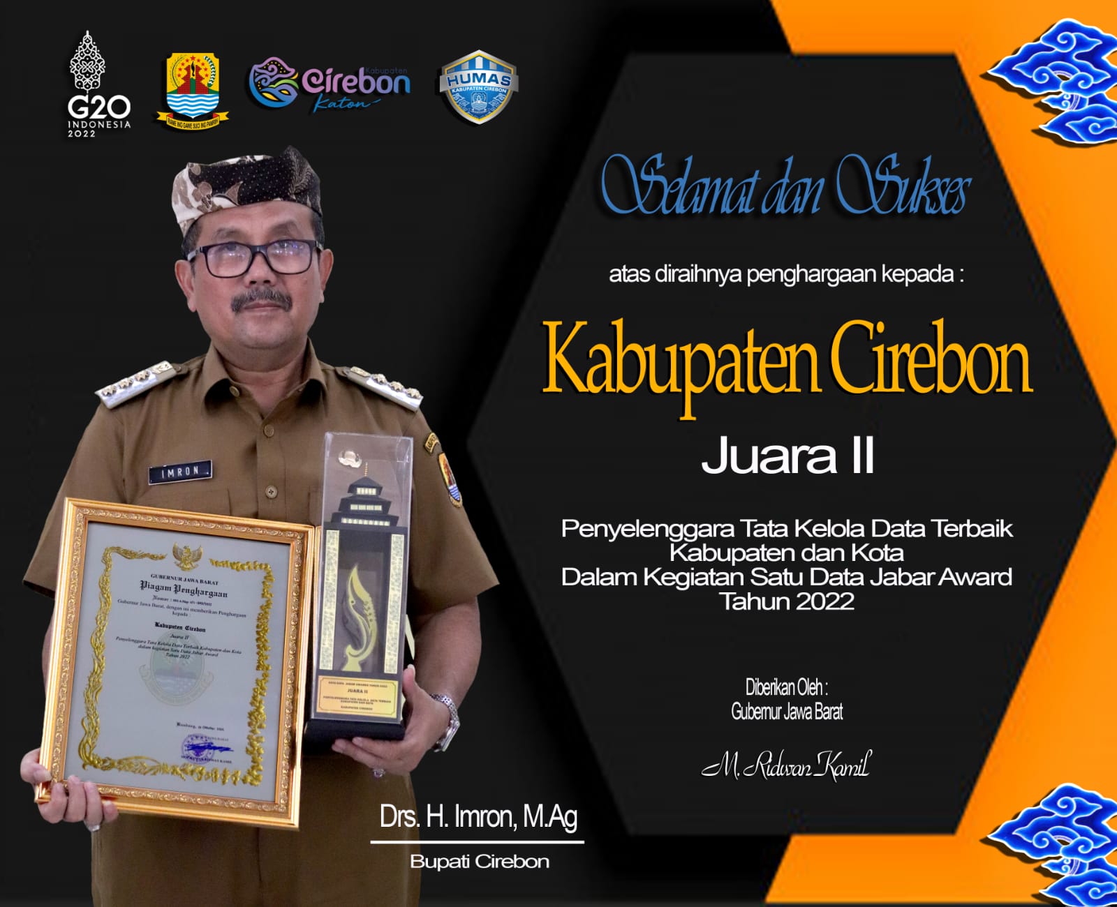 Cirebon Jabar, SIBER88.CO.ID_Pemerintah Kabupaten Cirebon melalui Dinas Komunikasi dan Informatika meraih Juara 2 Penyelenggara Tata Kelola Data Terbaik Kabupaten dan Kota pada ajang Satu Data Jabar Awards Tahun 2022. Penghargaan tersebut diterima langsung Kadiskominfo Kabupaten Cirebon, Nanan Abdul Manan SSTP MSi pada Acara Puncak Satu Data Jabar Awards di Hotel Aston Bandung, Jum’at malam (28/10/2022).
