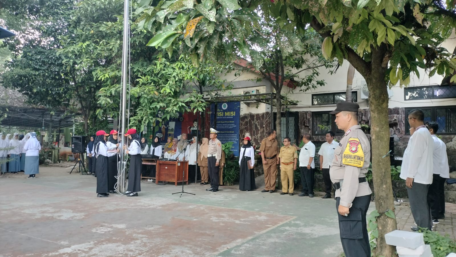 Kanit Binmas Polsek Bekasi Selatan Iptu Nurmanto didampingi Bhabinkamtibmas Jakamulya Bripka Sudirman dalam kegiatan Polri Go To School kali ini menyambangi SMKN 9 Kota Bekasi sekaligus menjadi Inspektur Upacara pada kegiatan Upacara Bendera bertempat di Lapangan SMKN 9 Kota Bekasi, Senin, (23/7/2023) pagi.