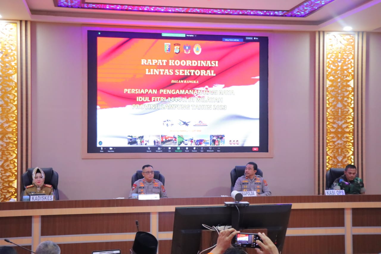 Lampung Selatan, SIBER88.CO.ID_Kapolda Lampung Irjen Pol Helmy Santika S.H.,S.I.K.,M.Si., bersama Wakapolda Lampung Brigjen Pol Dr Umar Effendi S.IK.,M.Si., Mengikuti Rakor Lintas Sektoral Dalam Rangka Kesiapan Pengamanan hari Raya Idul Fitri 1444 H, bertempat di Gedung Ruppatama Polda Lampung. Selasa (11/4/23)