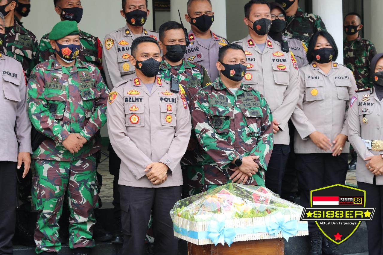 Pandeglang Banten, SIBER88.CO.ID_Jajaran Kodim 0601 Pandeglang mendadak didatangi Kapolres Pandeglang AKBP Belny Warlansyah, S.H.,S.I.K. M.H beserta rombongan. Mereka memberi kejutan dengan membawa tumpeng dan Kue Ulang Tahun peringati HUT ke-76 TNI halaman Kodim 0601 Pandeglang.