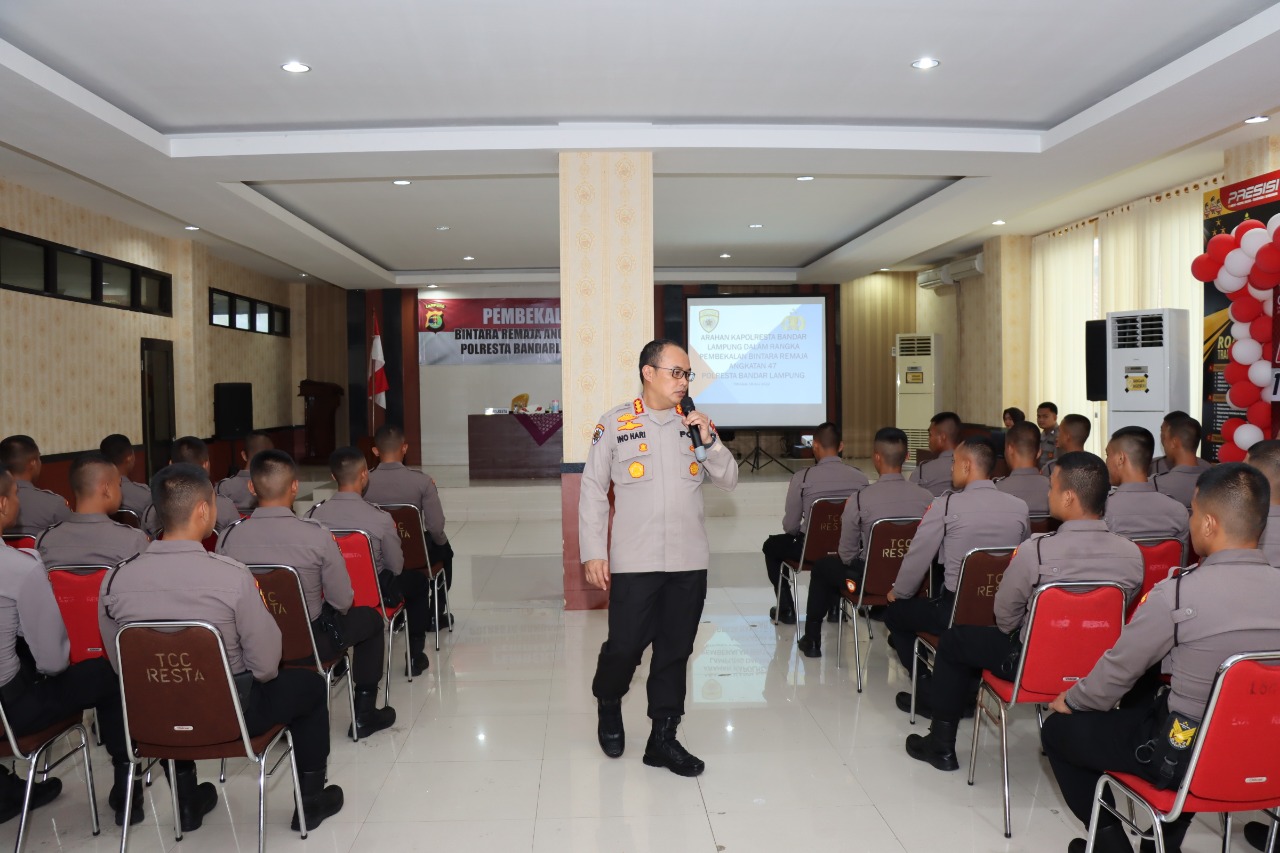 Bandar Lampung, SIBER88.CO.ID_Kombes Pol Ino Harianto, S.I.K selaku Kapolresta Bandar Lampung memberikan arahan kepada 38 bintara remaja angkatan 47 yang bertugas di Polresta Bandar lampung, pada hari Selasa 19 Juli 2022 di Aula Patria Tama.