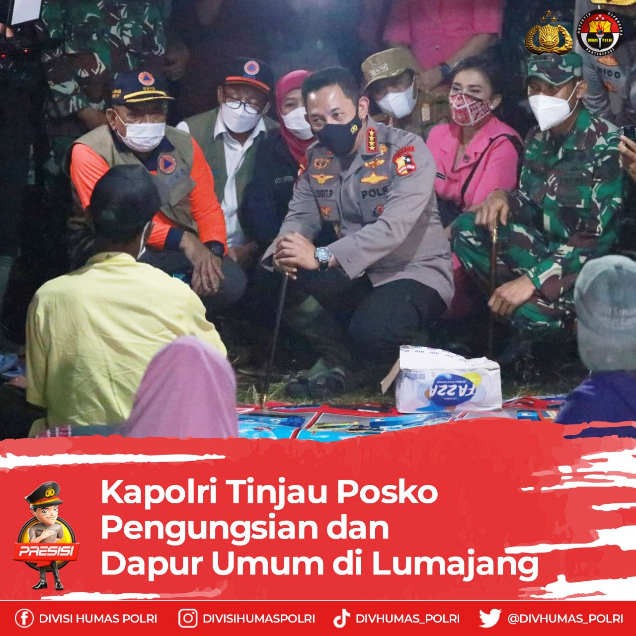 Lumajang Jatim, SIBER88.CO.ID_Kapolri Jenderal Polisi Drs. Listyo Sigit Prabowo, M.Si., meninjau Posko Pengungsian dan Dapur Lapangan di Desa Sumber Wuluh, Kecamatan Candipuro, Kabupaten Lumajang, Senin (6/12). Posko tersebut dibangun untuk masyarakat yang terdampak bencana erupsi Gunung Semeru. Di dapur yang didirikan secara darurat tersebut, diawaki oleh personel Polisi Wanita (Polwan) yang bertugas sebagi juru masak makanan bagi para pengungsi.
