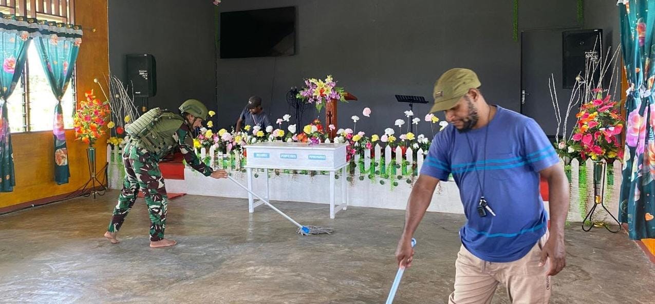 Personel Satgas Yonif 521/DY bersama warga bergotong royong membersihkan lingkungan gereja, merapikan halaman, memotong rumput, serta memperbaiki bagian fasilitas yang membutuhkan perhatian agar tempat ibadah menjadi lebih bersih, nyaman dan layak digunakan.