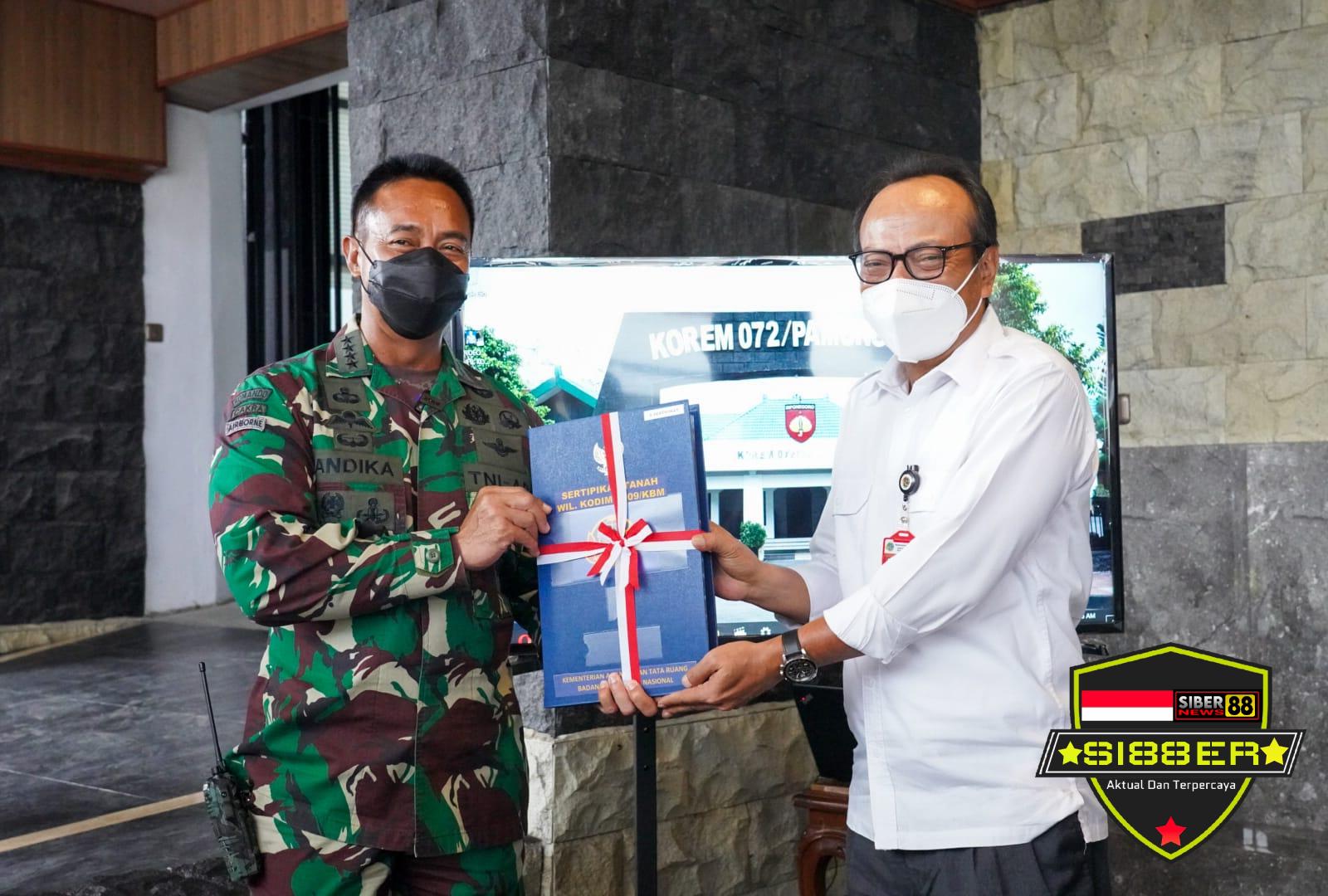 Yogyakarta, SIBER88.CO.ID//Kepala Staf Angkatan Darat (Kasad) Jenderal TNI Andika Perkasa menerima penyerahan sertifikat tanah dari Kakanwil BPN Jawa Tengah dan Kakanwil BPN DIY, Sabtu (4/9/2021) bertempat di Markas Korem 072/Pamungkas Yogyakarta.