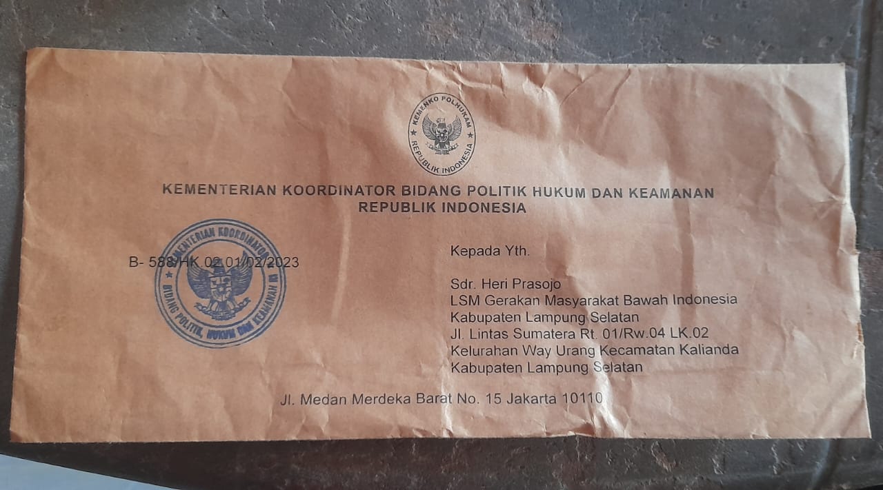 Lampung Selatan, SIBER88.CO.ID_LSM Gerakan Masyarakat Bawah Indonesia (GMBI) Lampung Selatan terima surat balasan dari Kementerian Koordinator Bidang Politik, Hukum dan Keamanan (Kemenkopolhukam) Republik Indonesia.