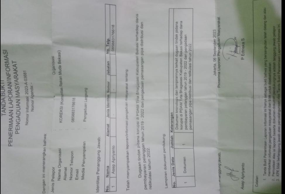 Jakarta, SIBER88.CO.ID_ Ketua tim Investigasi WN88,Asep Apriyanto, minta Kejari kabupaten Bekasi dan Komisi Pemberantasan Korupsi (KPK) segera menindaklanjuti laporannya tertanggal 14 September 2023 lalu, perihal dugaan gratifikasi dan korupsi di Perumda Tirta Bhagasasi yang terkesan masuk angin.