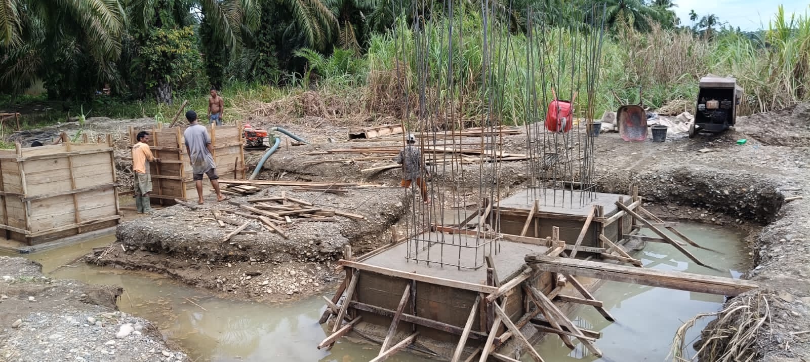 Pengerjaan jembatan dilakukan secara bertahap dengan melibatkan personel Koramil 09/Sosa Kodim 0212/TS bersama masyarakat dan tenaga tukang. Sejumlah tahapan pekerjaan yang telah dilaksanakan meliputi pengecoran pondasi dan blok beton di sisi tepi dekat, pembuatan mal foot plat, perakitan besi, hingga pengecoran foot plat.