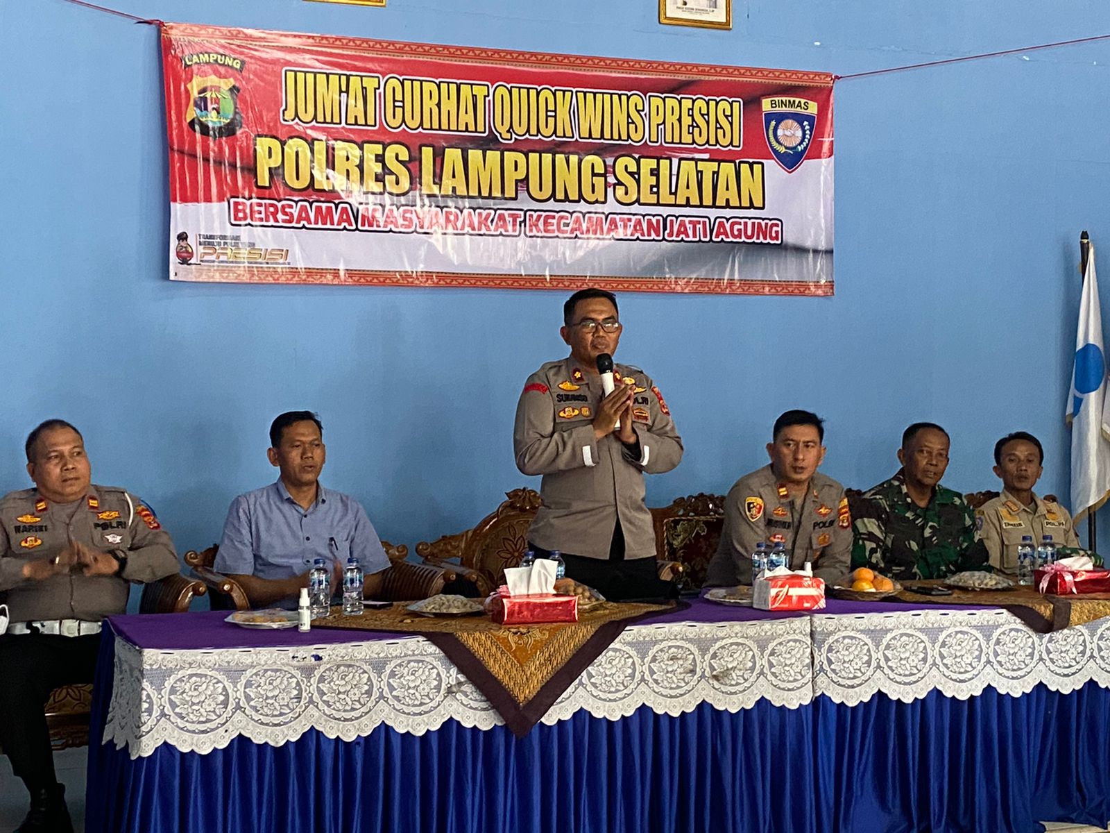 Lampung Selatan, SIBER88.CO.ID_ Polres Lampung Selatan kembali melaksanakan jum’at curhat quick wins presisi untuk menampung keluhan dan aduan warga di Kecamatan Jati Agung Kabupaten Lampung Selatan. Kegiatan tersebut dipimpin langsung oleh Waka Polres Lampung Selatan, KOMPOL Sukamso, pada Jumat (10/02/2023)