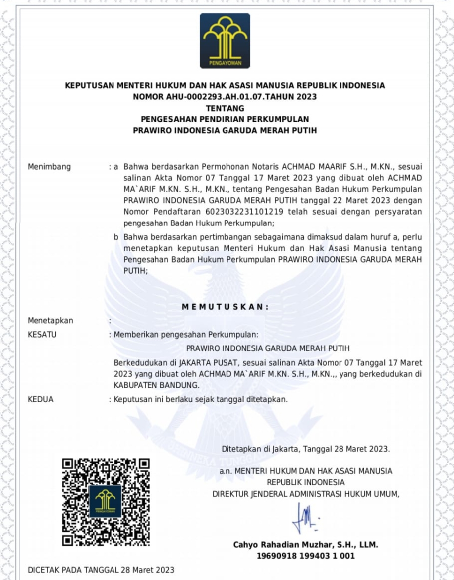 “Sekaligus mengangkat dan mengukuhkan beliau sebagai ketua dewan penasehat/pembina Prawiro IGMP, yang sudah terdaftar di KEMENKUMHAM baik nama maupun logo dg No AHU 0002293 AH 01.07 tahun 2023. Tanggal 28 Maret 2023 (akte dan logo terlampir),”terang Yudo.